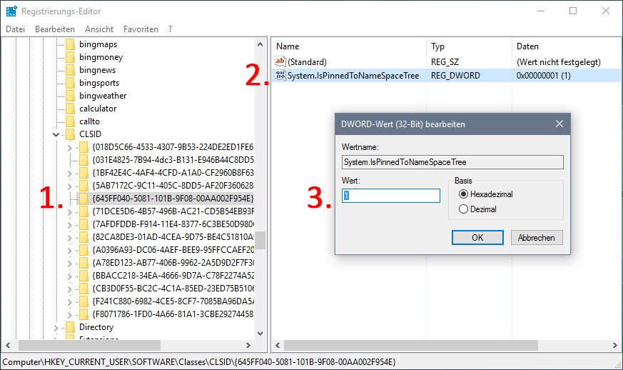 Um den Papierkorb im Explorer von Windows 10 anzuzeigen, macht ihr Folgendes: Drückt die Tastenkombination Windows + R, um den Ausführen-Dialog zu öffnen. Tippt regedit ein und bestätigt mit der Eingabetaste. Der Registrierungs-Editor öffnet sich. Navigiert zum Schlüssel: HKEY_CURRENT_USERSOFTWAREClassesCLSID{645FF040-5081-101B-9F08-00AA002F954E} Hinweis: Wenn der Schlüssel {645FF040-5081-101B-9F08-00AA002F954E} nicht vorhanden ist, klickt ihr mit der rechten Maustaste auf den Schlüssel CLSID, wählt den Eintrag Neu, Schlüssel aus und nennt den neuen Schlüssel {645FF040-5081-101B-9F08-00AA002F954E}.