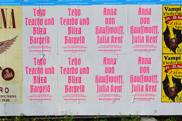 So, what to make of this? I’m on the fence here. On one hand, I’m a sucker for blackletter type, and I love to see it in contemporary use. On the other, I wonder whether it was necessary to include Potsdam and Nürnberg in the mix. What’s in a name? Well, see above. Does the Volksbühne really want to put itself into this lineage? Why tie in with the aesthetics of the theater’s darkest years? If blackletter, why not something more recent like Kaas, Moyenage, Fakir, Rostrot, Brokenscript? There are countless unsuspicious typefaces that would fulfill the conditions of being attention-grabbing and unused in the theater world.I guess I know the answers. One is: It wouldn’t matter, because laymen will peg just any blackletter as “Nazi type”, irregardless of its origin. How ironic. Make no mistake — LSD is very much aware of the status of blackletter as Nazi victim. Leonard Neumann: We have provided the theater staff with background material on the ban of Fraktur in Nazi Germany from 1941 on. This way, the intended unsettledness [of the audience] may lead to obtaining an information that actually is not one-dimensional. The true reason for banning blackletter and defaming it as “Jewish” was the fact that it was considered illegible outside of Germany, and hence was in the way to world domination somehow. It’s a good example for how propaganda works.The other answer is: Volksbühne doesn’t have to be “tasteful”, let alone politically correct. They want to provoke. And they come off best by choosing the most extreme option — not Bastard, but “the real thing”. I find this kind of provocation a little superficial and maybe too easy, but its effectiveness is hard to deny. I’ll give them that: The Volksbühne is likely the only institution that gets away with bringing Potsdam and Nürnberg back to the streets of Berlin.