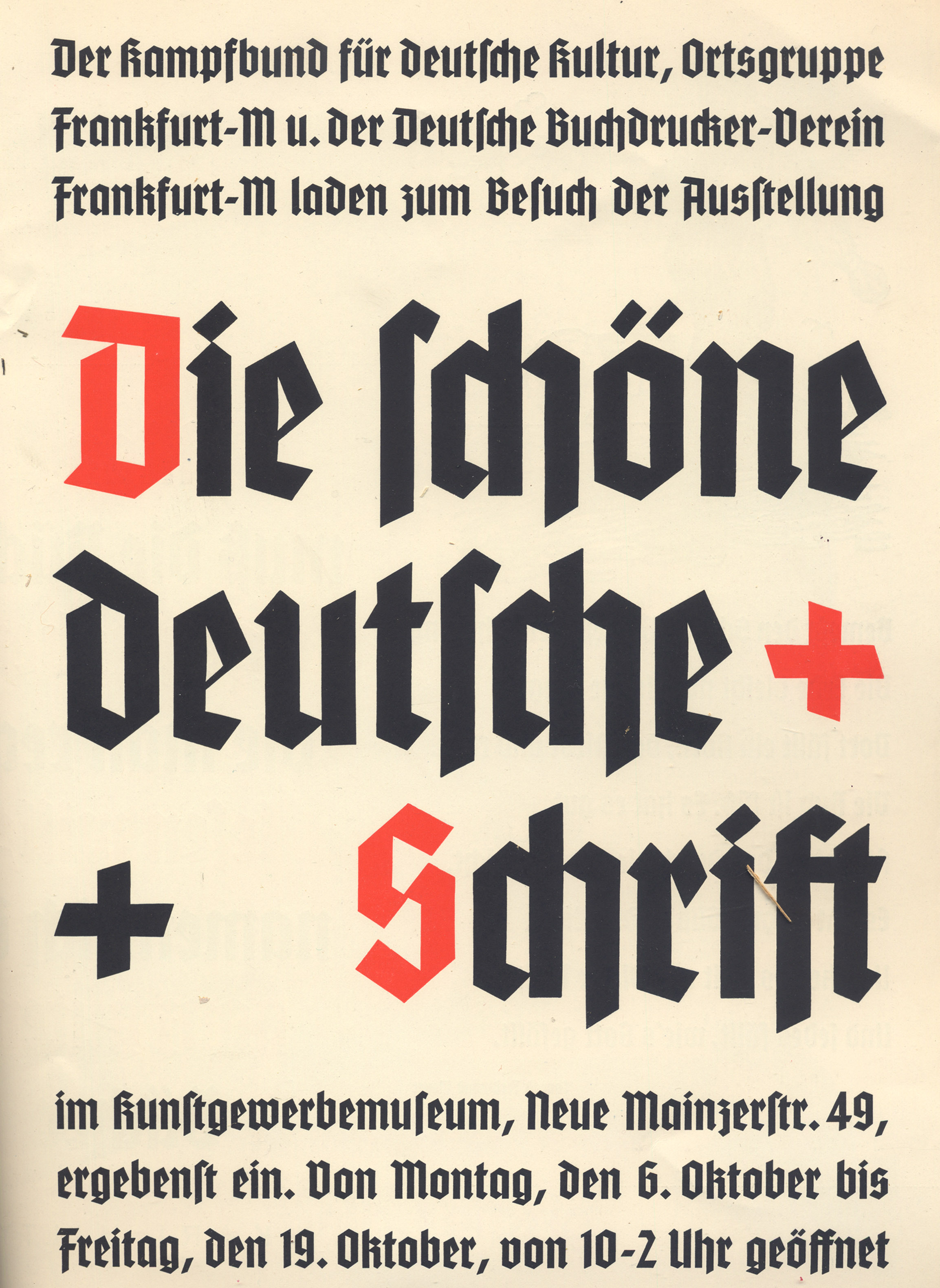 There are four typefaces advertised in the issue, two texturas in the new schaftstiefelgrotesk style and two Baroque frakturs: a double-page insert for Tannenberg Schmale (with text announcing an exhibition of “Die schöne deutsche Schrift” sponsored by the Kampfbund für Deutsche Kultur in the Kunstegewerbemuseum in Frankfurt) from D. Stempel AG, a quarter-page advertisement for Leibniz-Fraktur from Genzsch & Heyse AG, another quarter-page advertisement for Standarte (described as “Eine neuer schöner Ausdruck deutschen Formwillens”) from Schelter & Giesecke, and the back cover dedicated to Original Breitkopf-Fraktur (described as “Eine charaktervolle deutsche Schrift für das gute Buch und für die Akzidenz…”) from Ludwig Wagner AG. The Standarte showing is accompanied by Rhythmus, a Futura clone. The mix of new, modernist-inflected blackletter faces and classical, literary ones symbolizes two different visions of German greatness, those looking to the industrial future—the advertisement for Mergenthaler Setzmaschinen-Fabrik GmbH is set in Tannenberg Schmale—and those looking to the cultural past.